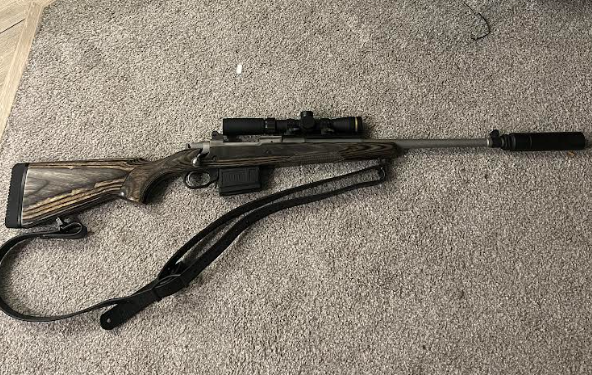 This particular Ruger GSR features a matte stainless steel 18-inch barrel with a Leupold scope and a suppressor.