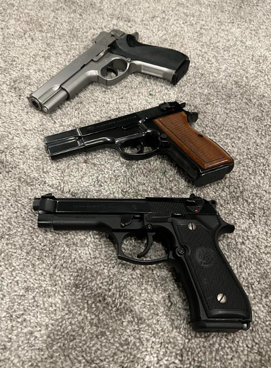 A collection of three metal-framed pistols: the Smith & Wesson 4506 in .45 ACP, the Mauser 90DA in 9mm, and the Beretta M9 in 9mm.